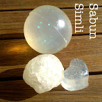 Elimde tam aynı sim yoktu ama benzeri olanı var. Saboneteando kullandığı sim çubuk şeklinde bizimki toz halinde ve görünüşü olarak çok daha fazla kullandı. Simli bir kalp yeni silikon kalıbımız ile yaptım. Bir sabun topu yaptım Proje 5 de gibi. Ve en son olarak bir 3D buz kalıbı kullandığım. Bunu hiç tavsiye etmiyorum, en az plastıklı olanlar değil, sabun çok zor çıktı.